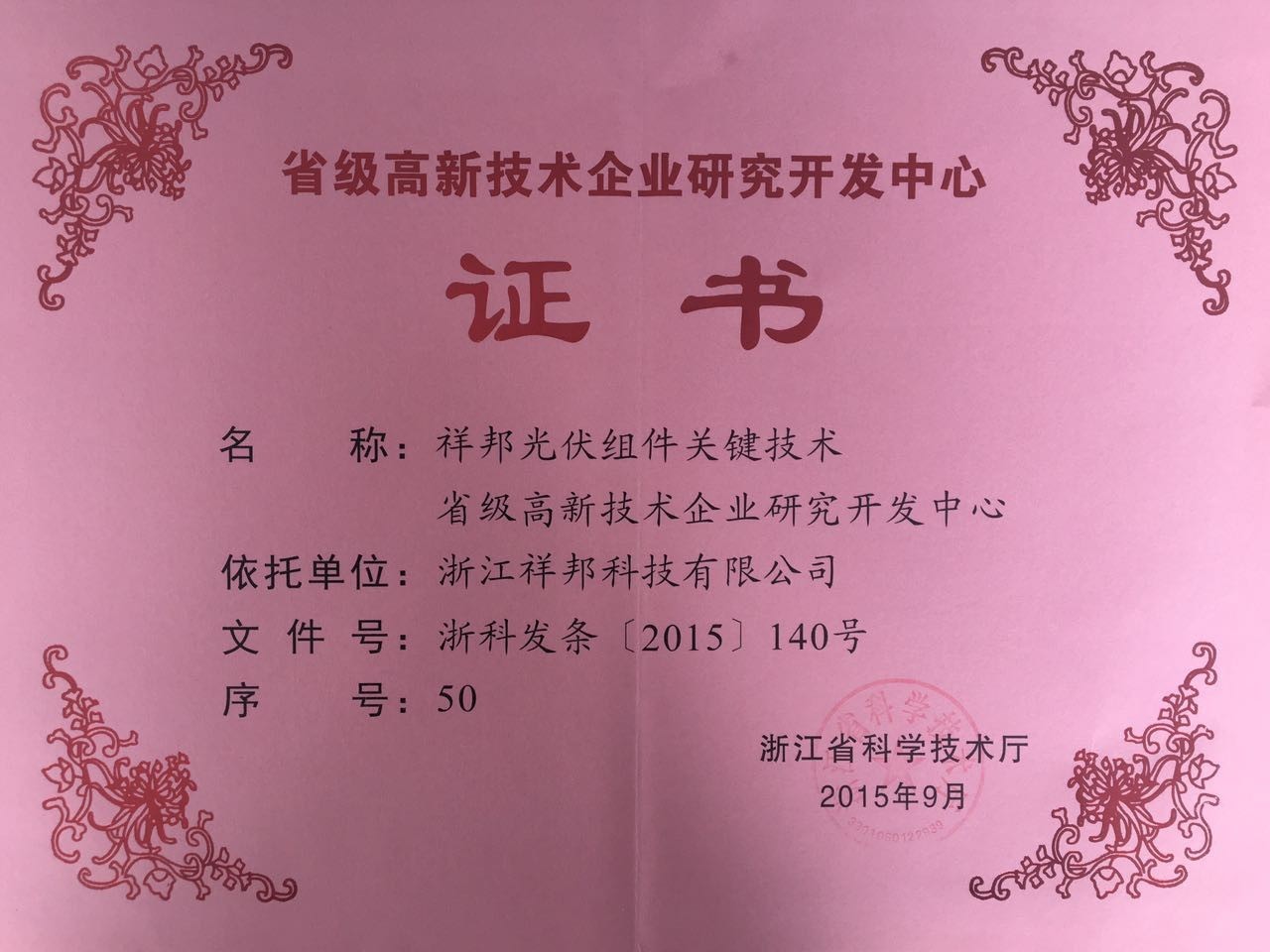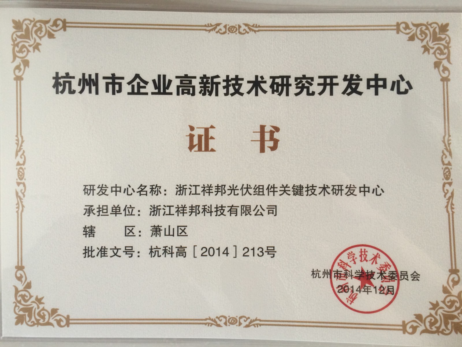 祥邦光伏組件關鍵技術省級高新技術企業(yè)研究開發(fā)中心