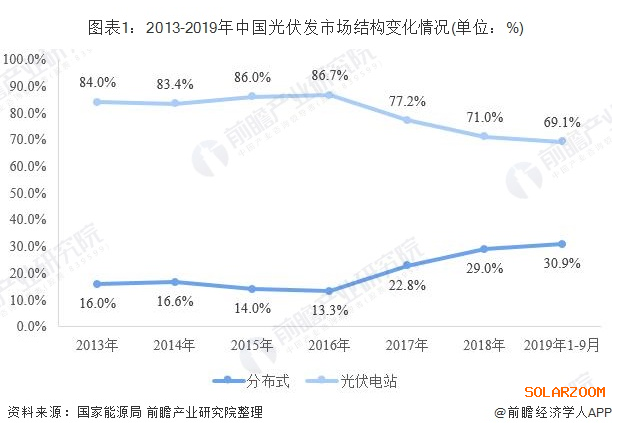 不同于光伏電站,分布式光伏發(fā)電是指在用戶所在場地或附近建設運行,以用戶側自發(fā)自用為主、多余電量上網且在配電網系統平衡調節(jié)為特征的光伏發(fā)電設施。近年來,國家對分布式光伏發(fā)電系統一直采取積極鼓勵的態(tài)度,并出臺了一系列扶持措施。2016年底出臺的《電力發(fā)展“十三五”規(guī)劃》對分布式光伏設定了超常規(guī)發(fā)展目標:“2020年,太陽能發(fā)電裝機達到1.1億千瓦以上,分布式光伏6000萬千瓦以上”。隨著各地分布式光伏發(fā)電建設的推進。我國光伏發(fā)電市場結構發(fā)生改變,尤其是2016年以來,我國分布式光伏市場份額已經由13.3%提升至30.9%。