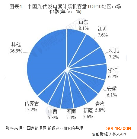 累計裝機容量方面,截至2019年第三季度,我國共有9個地區(qū)光伏發(fā)電累計裝機容量超過1000萬千瓦。其中山東以1541萬千瓦,排名第一,占全國總裝機容量的8.1%;江蘇和河北緊隨其后,分別以1445萬千瓦和1363瓦千瓦占全國總裝機容量的73.6%及7.2%。